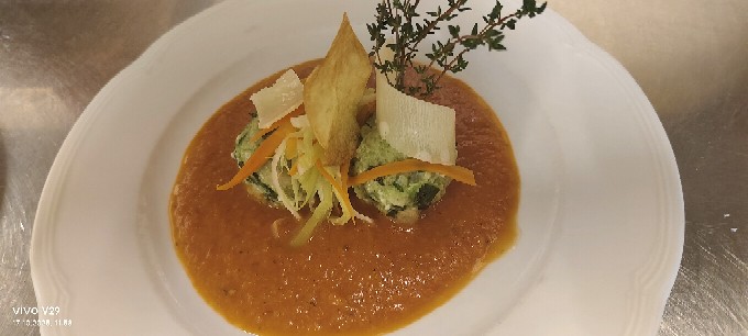 Bild 2: Spinat-Käseknödel mit Grana Padano auf Tomatensauce. Bild 3: Geschmorter Rinderbraten vom Almochsen mit Preiselbeeren.