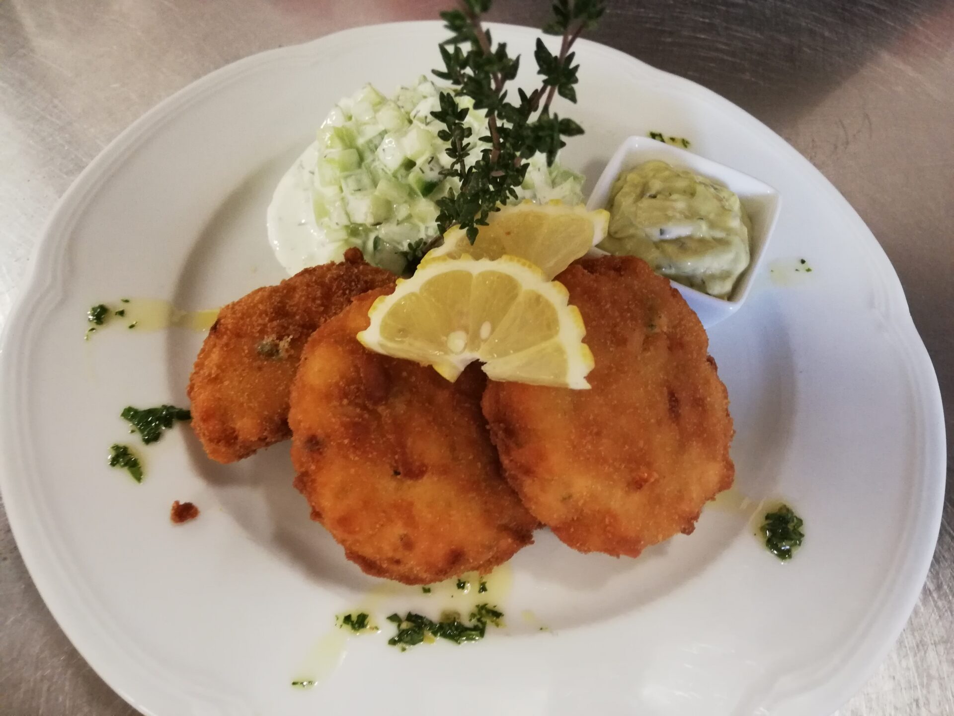 Bild 4. Gebackene Kasspatz`n mit Rahmgurken und Sauce Tatare.